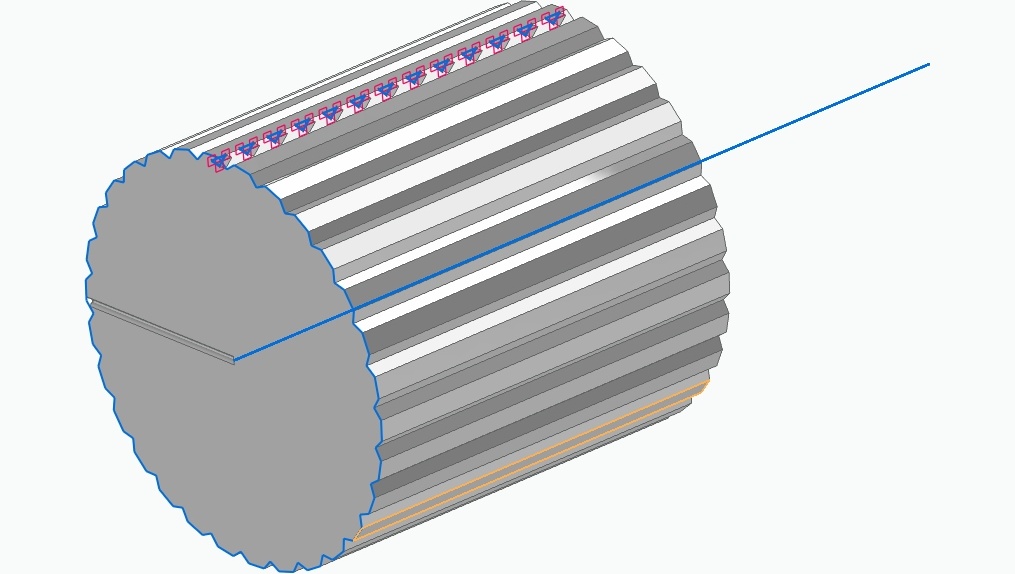 Show All ParametersAI Original Query: Create a potentiometer knob with a diameter of 56mm and a 5 centimeter height with a hole of 5mm diameter. A surface type is grooved with 1 millimeter depth and the material is bronze.