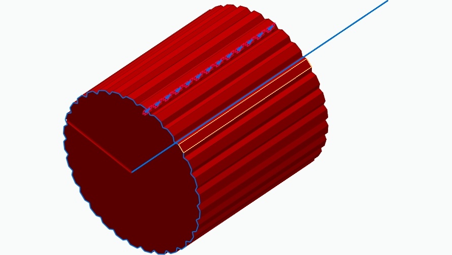 Show All ParametersAI Original Query: Create a potentiometer knob with a diameter of 48mm and a 5 centimeter height with a hole of 5mm diameter. A surface type is grooved with 1mm depth and the material is red.