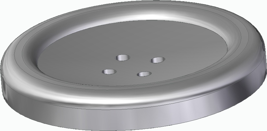 create button 35mm diameter, height 5mm, edge depth 3mm, edge width 5mm filet radius 2mm, 4 holes in silver |