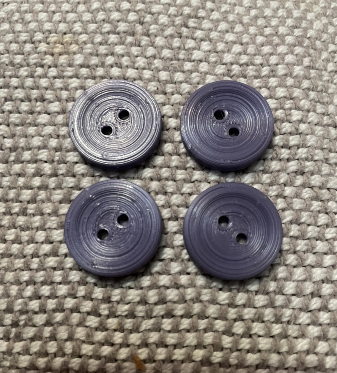 Сделай круглую пуговицу полтора сантиметра диаметр две дырки диаметр дырки 1,5 мм расстояние между дырками 4 мм цвет фиолетовый толщина 1,5 мм Comment : 4 buttons |